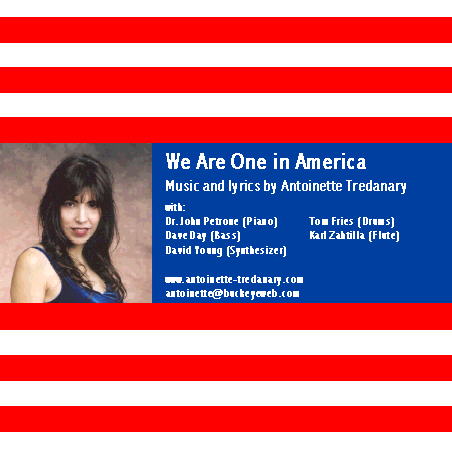 Shortly after the September 11th terrorist attack, Antoinette took pen in hand to write a beautiful new patriotic song called "We Are One in America". Set to a 3/4 (waltz) tempo, "We Are One in America" is the kind of song that sticks in your mind long after the last note fades. While most patriotic songs have a single message, "We Are One in America" beautifully combines the feelings of sorrow, unity of purpose, and patriotism that most Americans felt after the 9-11 attack. At the end of the song, Antoinette uses the fading drums to make the powerful statement that freedom is worth fighting for. |